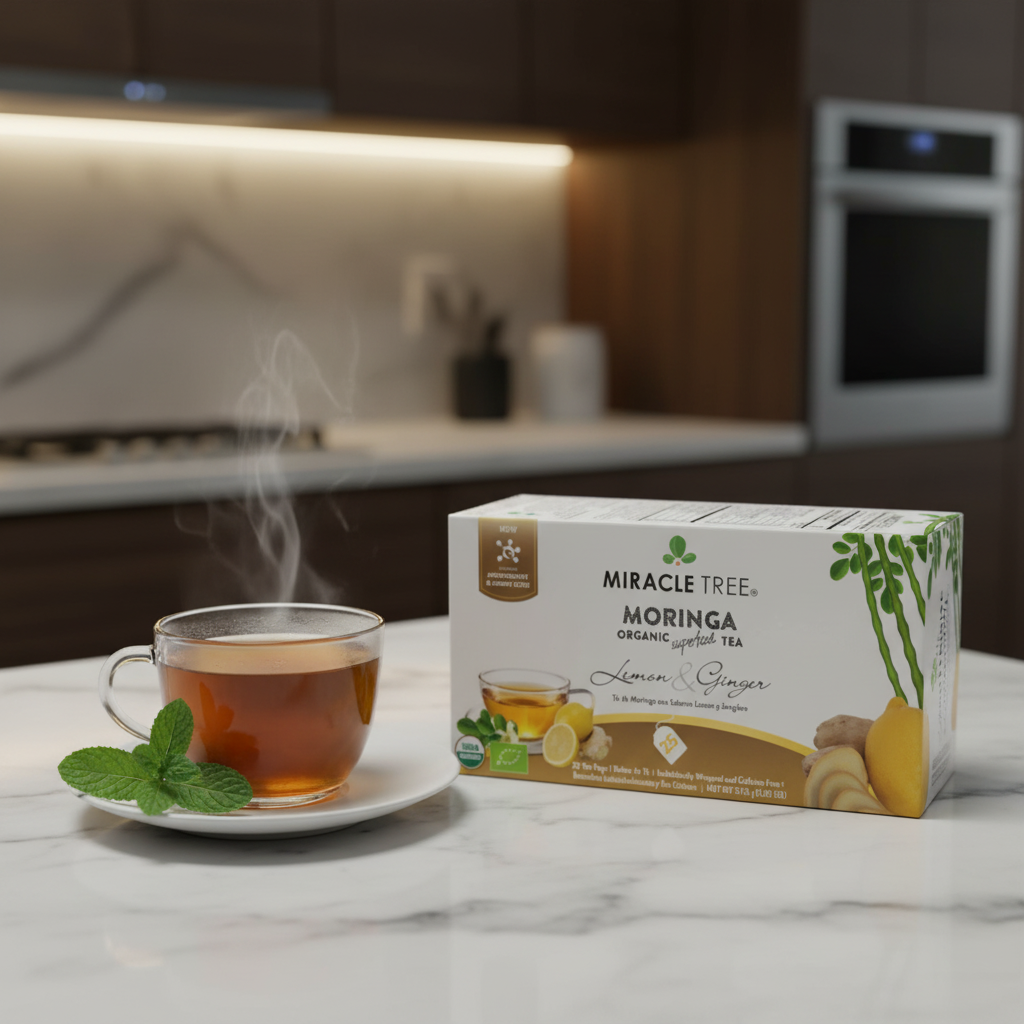 Moringa—often called the “Miracle Tree”—is celebrated for its rich concentration of vitamins, minerals, and natural antioxidants. When combined with citrus and ginger, this tea becomes a wonderfully balanced infusion designed to support immunity, energy, digestion, and daily vitality.