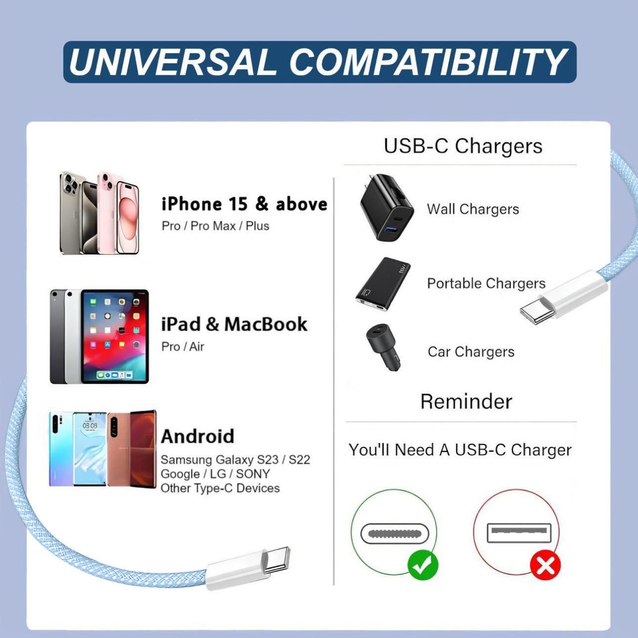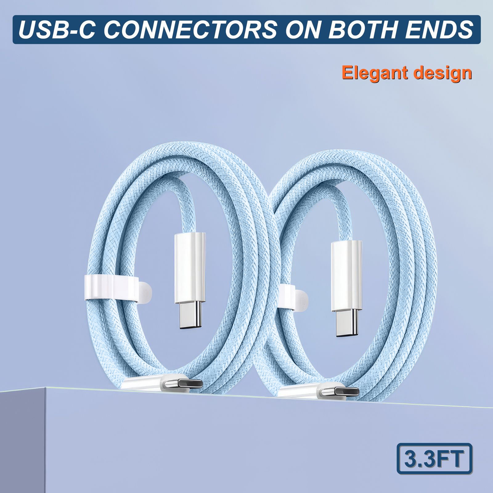 ✔ 2 × USB‑C to USB‑C braided cables, 3.3 ft each