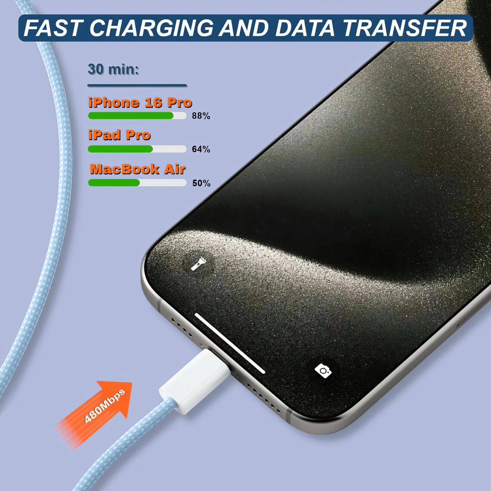 Supports up to 60W fast charging and up to 480 Mbps data transfer for quick power‑ups and reliable syncing. Gives quick top‑ups when paired with a USB‑C PD adapter.